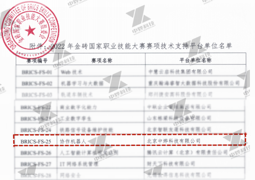 7月29日,金砖国家职业技能大赛组委会发布文件《关于公布2022年金砖国家职业技能大赛赛项技术支持平台单位的通知》,中烨科技将为2022年金砖国家职业技能大赛“协作机器人”赛项提供全流程技术支持!