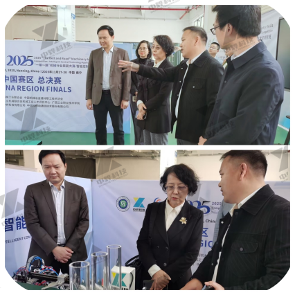 开幕式后,中国机械工业联合会党委常委、总工程师李燕霞,广西工业职业技术学院副校长谭冠晖,裁判长宁玲玲教授,北京中烨科技有限公司总裁林海鹏等一行人巡视了竞赛场地,详细了解赛事组织、设备配置及选手备赛情况。作为技术支持单位负责人林海鹏向莅临现场的领导们详细介绍了本次竞赛的核心设备。